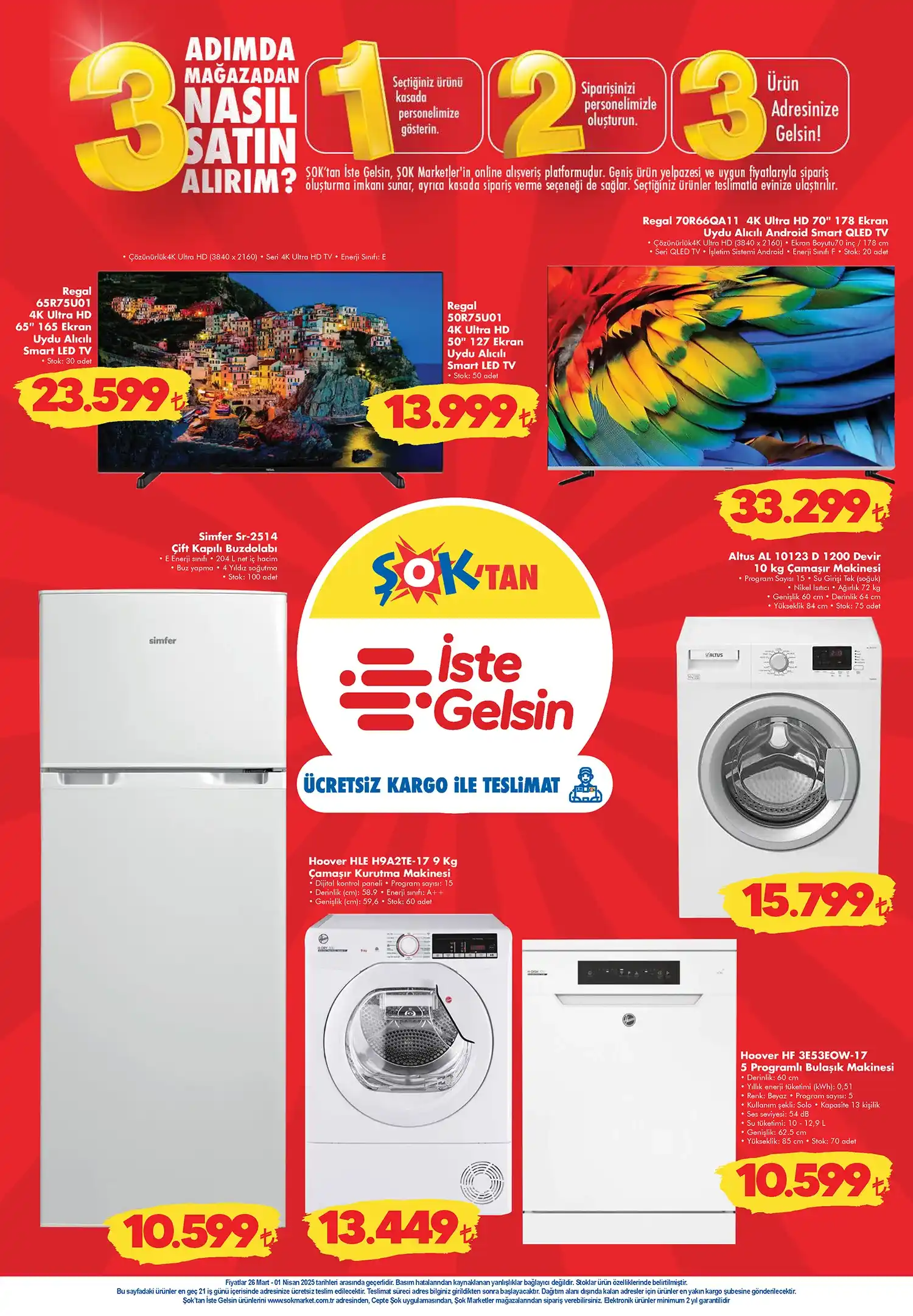 ŞOK 26 Mart 2025 kataloğunda sadece bahçe ve mutfak ürünleri değil, beyaz eşya ve televizyon kategorilerinde de dikkat çekici kampanyalar var. Kaliteli markalar, yüksek performanslı cihazlar ve avantajlı fiyatlar bu hafta ŞOK'ta!